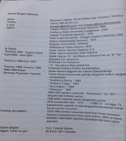 2004 e geldiğimizde bugünün değeri 350.000 tl sermayem var, İstanbul’a gittim. İstanbul’da ticari girişimlerim oldu, bir yandan da hisselere devam etmek için Bakırköy Gedik Menkul Değerlere gittiğimde Ahmet Mergen ile karşılaştım. Kendisine hikayemi anlatınca “bundan sonra kitap yazmayacağım son kitabımı sana hediye ediyorum” dedi. Bende başucu kitabım olarak halen saklıyorum.