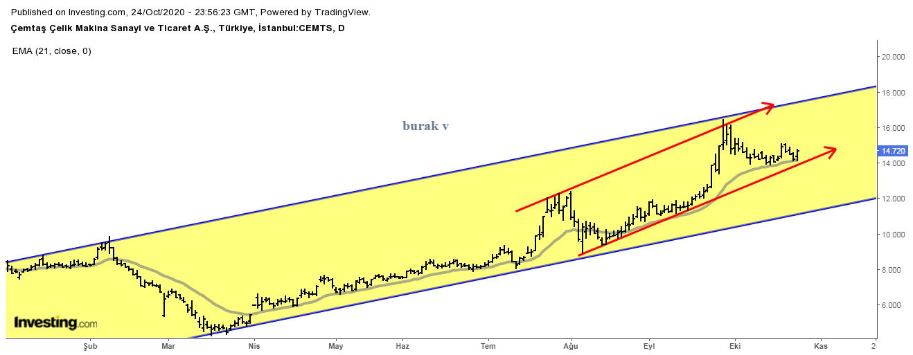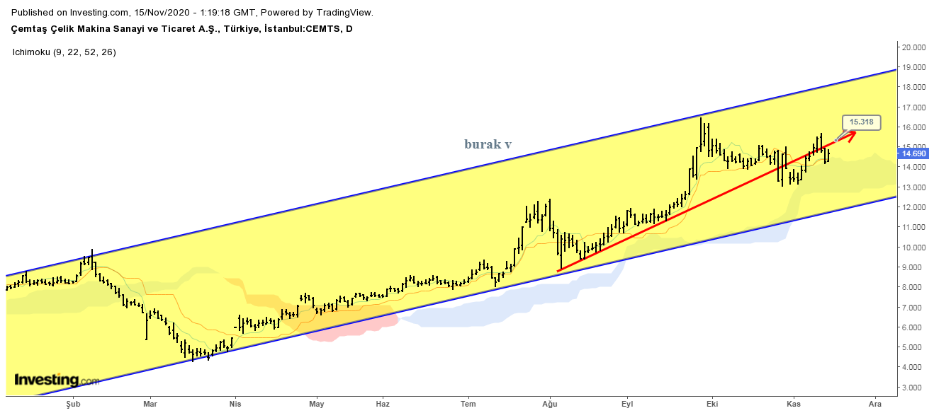 15/11/2020 yorum: Hisse kısa vade yükselen trend çizgi desteği altına sarkmış durumda. Tekrar bu trende girmek için çaba sarfediyor. 15,30 bu anlamda önemli bir bölge. Aşağıda ise 14,00 TL desteği mevcut. Hisse bu seviyeüstünde kalmayı başarırısa pozitif görünümünü korur.