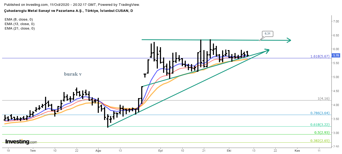 Hisse senedi yükselen trend desteğinde ve daha geniş açıdan bakılacak olursa üçgenbir sıkışma durumunda sona doğru yaklaşıyor.