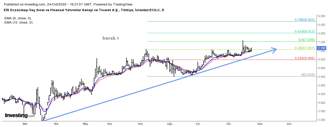 Yükselen trend üstünde hareket eden ECLIC hisse senedinde 7,05 üstünde kaldıkça pozitif görünüm sürer. Grafik üstündeki FIBO seviyeleri yukarı yönlü takip edilebilir.