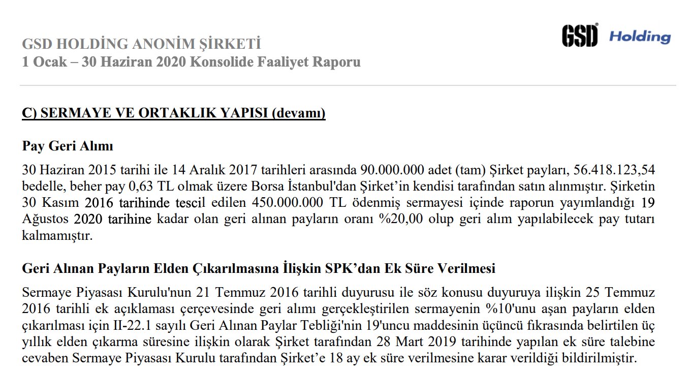 NOT: Halka açık her şirket için, Şirket paylarının geri alınması kapsamında geri alınan paylar SPK yasal mevzuat gereği geri satılmak durumundadırlar. GSDHO hissesinde olan durum da budur.