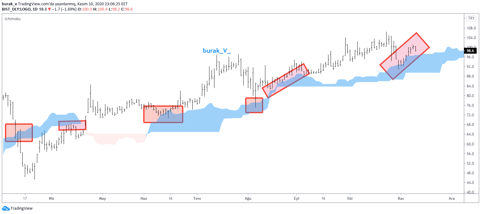 10/11/2020 yorum: Ichmoku indikatörü ile analiz edilmiştir. Bu indikatör bir trend göstergesidir. Grafik üzerinde işaretlemeye çalıştığım alanlar hisse fiyatı için destek bölgeleridir. Kırılımı halinde sert düşüşler görülürken, kırılamadığı durumlarda da sert yükselişler görülür.