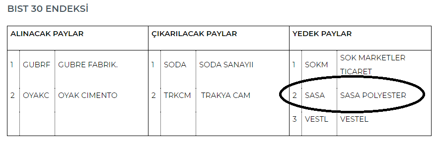 SASA bist30 yedek listesine alındı