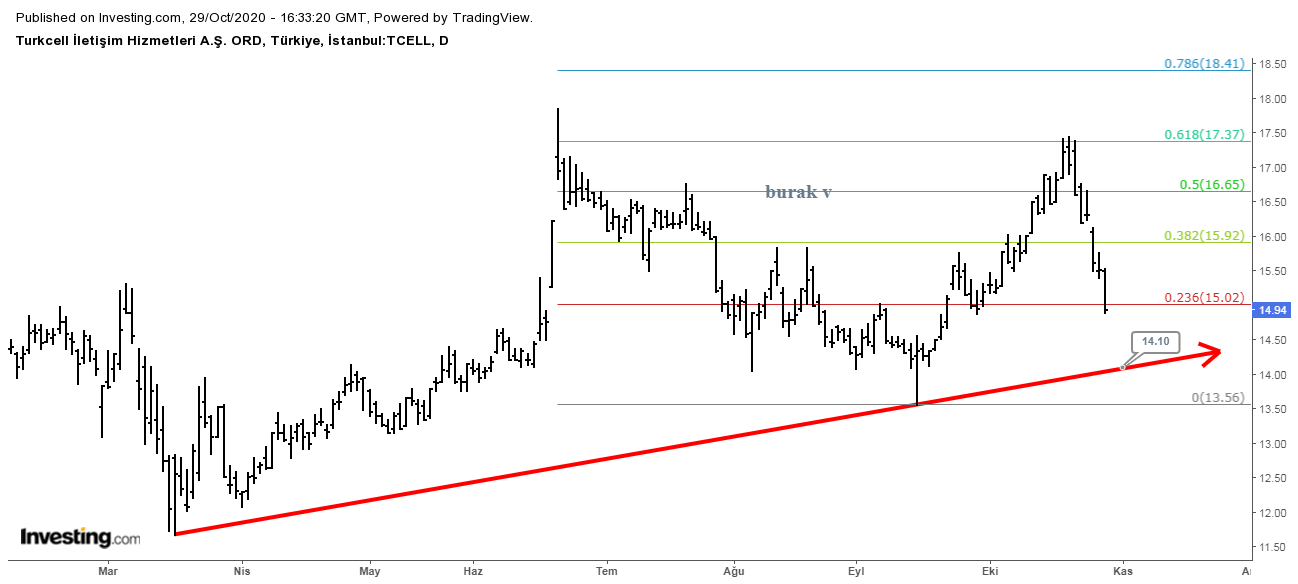 Yükselen major trend çizgisi ile düşen minör trend çizgisinin kesişim noktalarında fiyatlanan tcell hissesinde, kötü senaryonun devamında 12.80 seviyelerine denk gelen FİBO destek seviyeleri ve 11.9x sevilerindeki FİBO destek seviyeleri takip edilebilir.