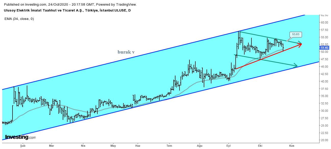 ULUSE hisse senedi önemli bir destek bölgesinde. 50,70ler üstünde kaldıkça pozitif değerlendirilebilir. Aksi durumda mavi kanal alt bandına inebilir.