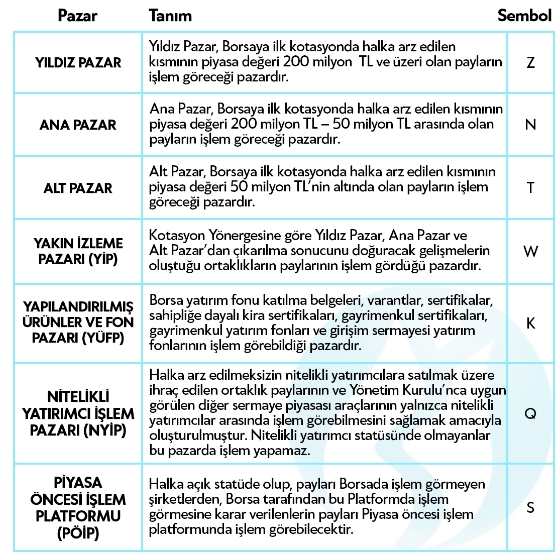 İşte hisselerin pazar sınıfları. Önce Hisse senedi piyasamızda pazarlar neler? bir bakalım.